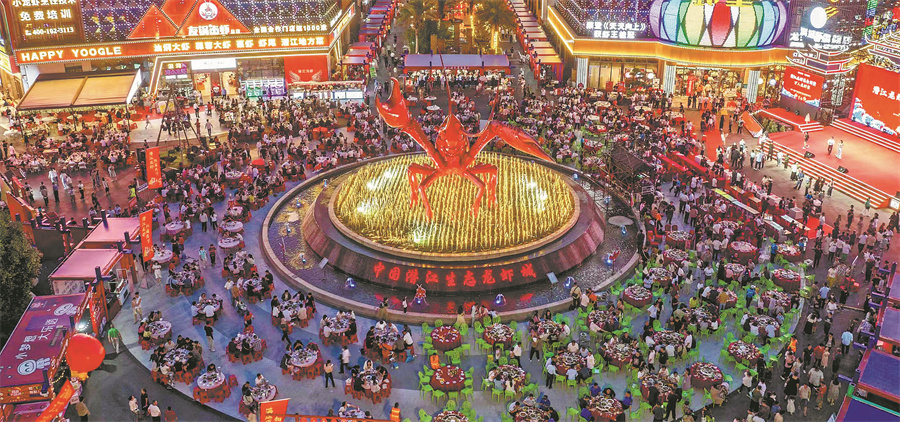 Местни жители и туристи се събират в Qianjiang, централнокитайската провинция Хубей, за да опитат вкусни ястия от раци. [Photo provided to China Daily]