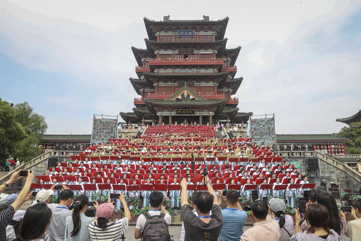Ученици в традиционни костюми рецитират предговора към павилиона на принц Тенг от поета Уан Бо от династията Тан (618-907) пред павилиона Тенгванг в Нанчанг, провинция Дзянси, в понеделник. Петата Национална конференция по четене се провежда от понеделник до сряда в Нанчанг, отбелязвайки началото на първата Национална седмица на четенето. LIU LIXIN/КИТАЙСКА НОВИНАРСКА СЛУЖБА