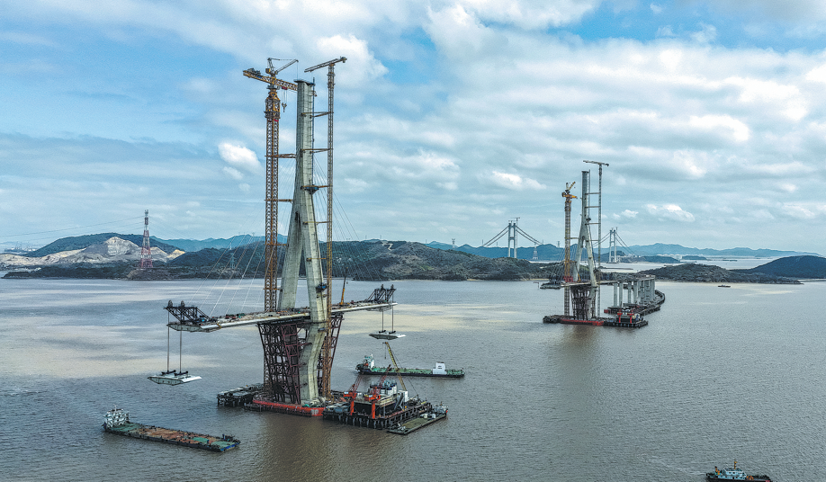 Изображение улавя строителството на моста Qinglongmen, свързващ островите Fodu и Meishan в провинция Zhejiang, в сряда. Разпростиращ се на 756 метра, проектът — съвместно изграден от звена на China Railway Construction Corp — представлява най-големият въжен мост с стоманена кутия и три кули в света. ЯО ФЕН/ЗА КИТАЙ ЕЖЕДНЕВНИК